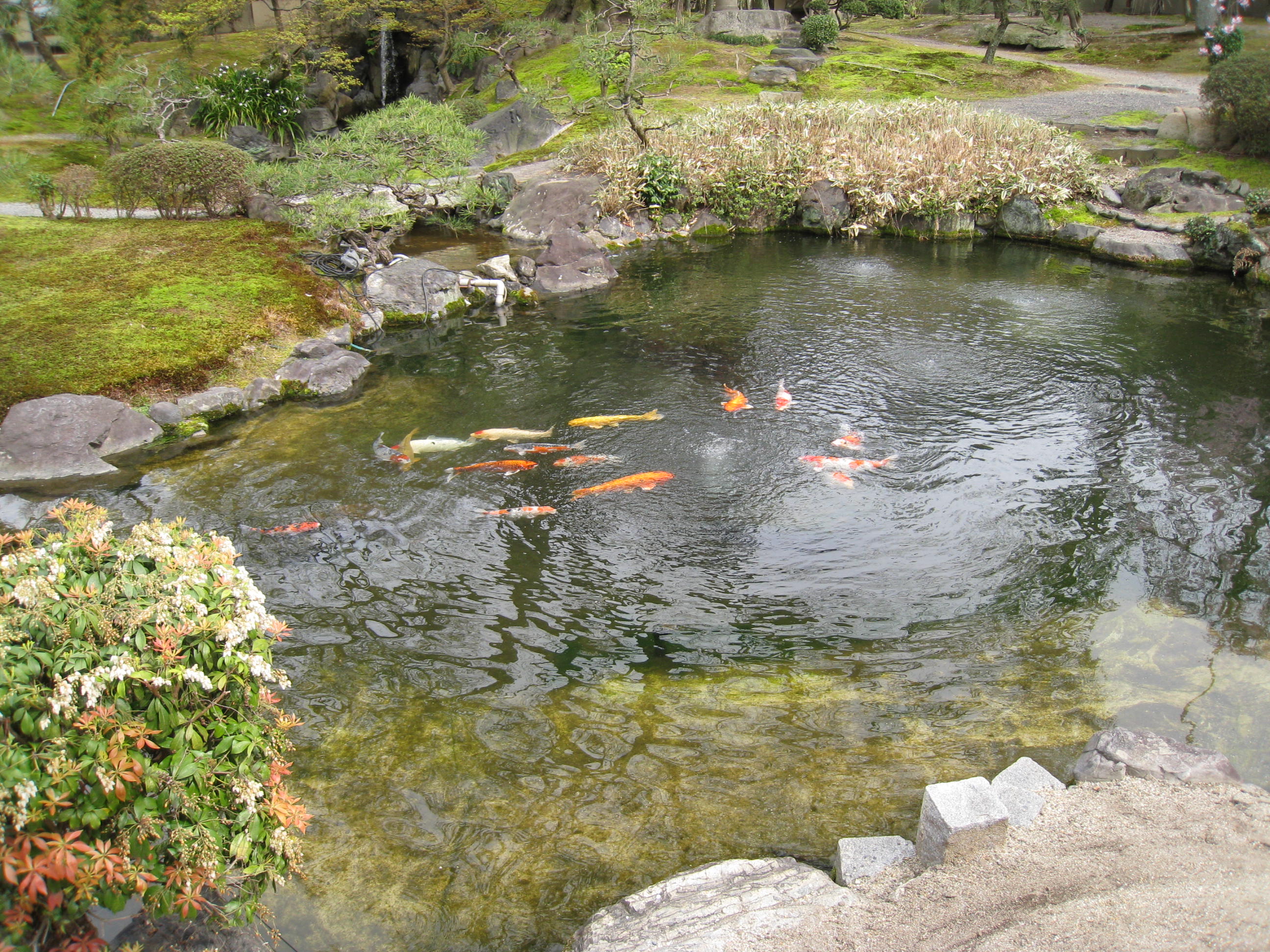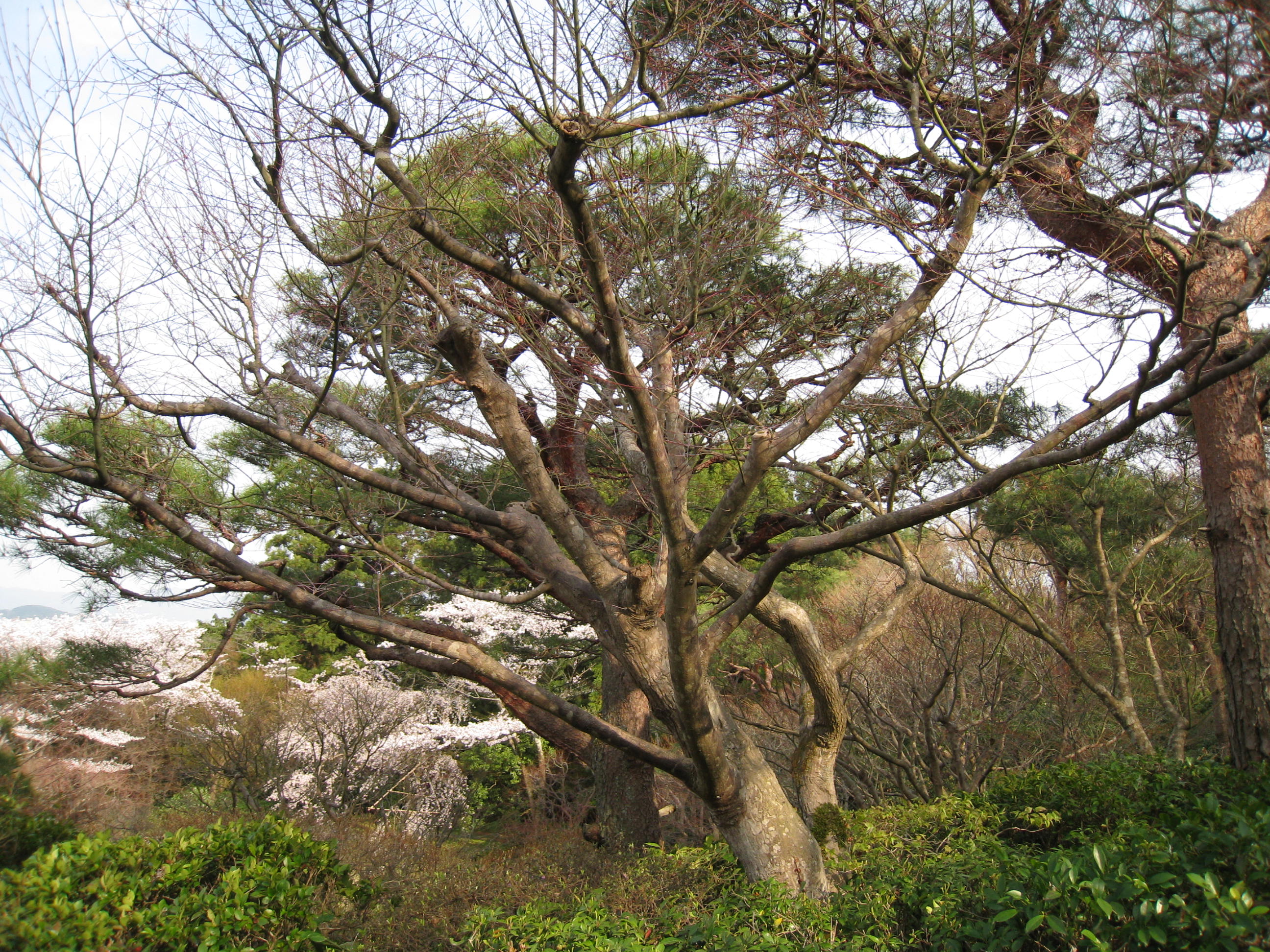 Beyond the bamboo forest is a hilltop garden, with a view of the city. Gardens seem to use mosses, not grass for their green carpeting.