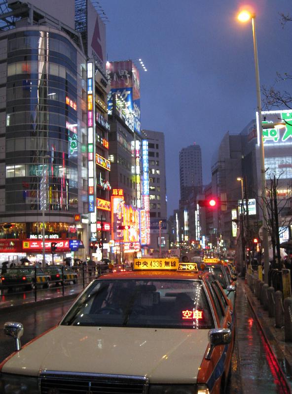 Tokyo sprawls like a three dimensional jigsaw puzzle, improvised out of an explosion of irregular boxes, its edge pieces apparently lost somewhere in time. It's tower-like centre rises out of an almost relentless sea of grey suburban housing, punctuated by a little half-hearted agriculture here and there. The Narita airport Express wends through a bland suburban jungle of dull concrete as it enters Tokyo. Apart from a small bamboo forest at the start of the journey, the landscape seems colourless and disappointing after a 10 hour flight, like the faded winter greens you see in a Norwegian winter, or a poorly developed photograph -- certainly not the brilliant emerald hills of the `green and pleasant' UK. It says `drab', but as first impressions go, this couldn't be more wrong.